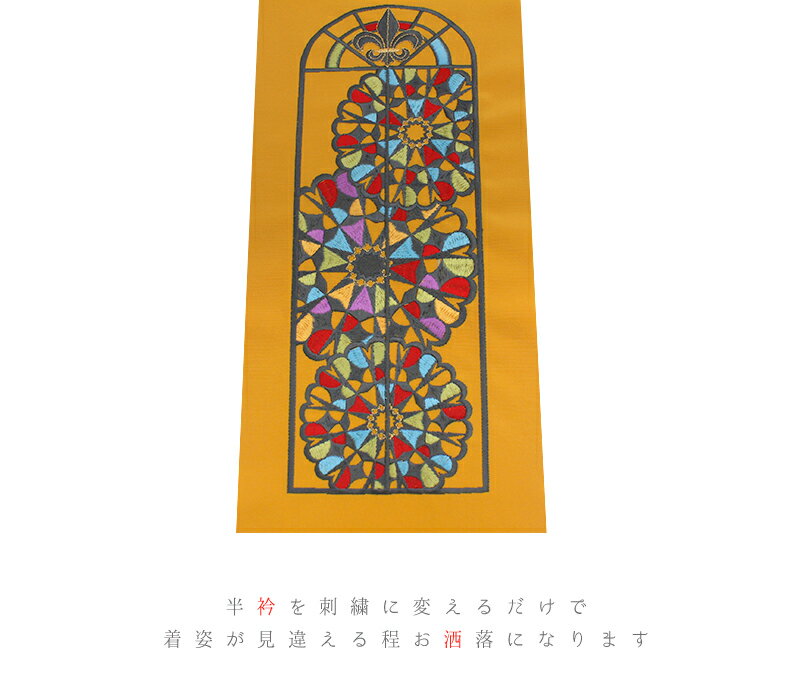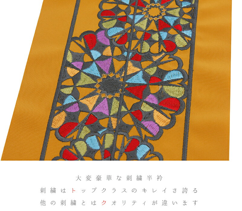 半衿 半襟 振袖 成人式 豪華刺繍 渋黄色 グレー 黄緑 赤 紫 水色 金 オレンジ ゴールド ステンドグラス 窓 花 幾何学模様 カラフル マルチカラー シルエリー Silelly おしゃれ半衿 刺繍半衿 お洒落着用 レトロ 古典 アンティーク モダン 高級 成人式 結婚式 前撮り 卒業式 謝恩会 入学式 卒園式 入園式 七五三 お宮参り お茶会 パーティー 観劇 かわいい ポリエステル 日本製 No.10-6020 サイズ表 サイズ 長さ:約115cm 幅:約16.5cm 商品詳細