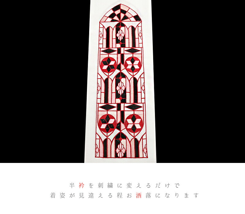 教会などのステンドグラスをかたどった、 ヨーロッパ文様の特徴的な刺繍が施されており ぱっと目を引く華やかさがある刺繍衿です。