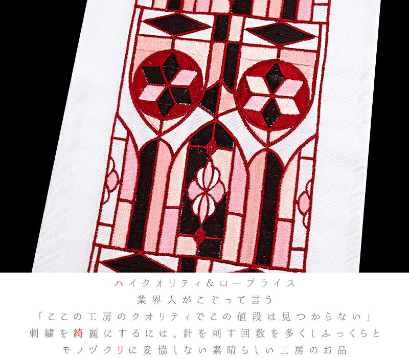 半衿 半襟 振袖 成人式 豪華刺繍 白地 オフホワイト 金 ゴールド 赤 黒 ピンク ステンドグラス 教会 ヨーロッパ文様 鞘型 綸子 LongCiel 礼装用 刺繍半衿 レトロ アンティーク モダン 高級 成人式 結婚式 前撮り 卒業式 謝恩会 入学式 卒園式 入園式 七五三 お宮参り お茶会 パーティー 観劇 可愛い ポリエステル 日本製 着物 和装 No.10-6376 サイズ表 サイズ 長さ:約115cm 幅:約16cm 商品詳細