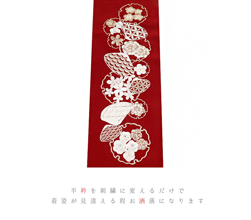 ■おすすめポイント 高級感あふれる、繊細で美しい刺繍が魅力的な 正絹風のなめらかな肌触りと上品な光沢を持ち合わせたポリエステル素材の いくつもコレクションしたくなる、おしゃれ半衿です。