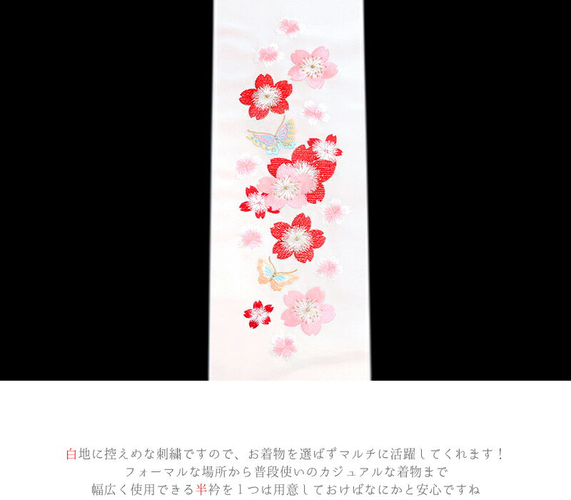 ■おすすめポイント お洒落は小物から・・・ 高級感あふれる、ふっくらと美しい刺繍が魅力的な 正絹風のなめらかな肌触りと上品な光沢を持ち合わせたポリエステル素材の いくつもコレクションしたくなる、お洒落半衿です。