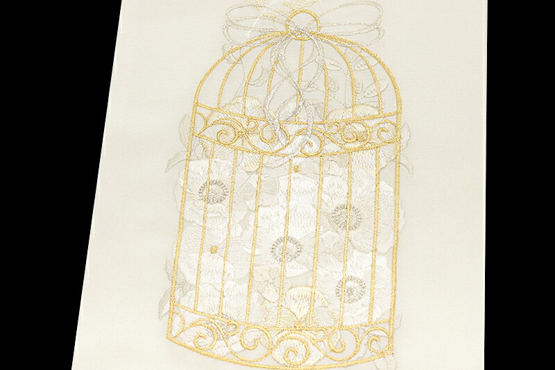 鳥かごの中に艶やかな牡丹の花々があしらわれた半衿です。