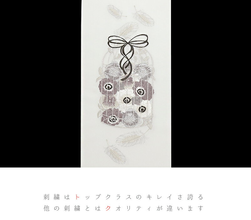 半衿 振袖 成人式 訪問着 刺繍 オフホワイト 礼装用 塩瀬 銀糸 紫 白 鳥かご 羽 花かご リボン 洋花 結婚式 前撮り 卒業式 謝恩会 入学式 卒園式 入園式 七五三 お宮参り お茶会 パーティー 観劇 日本製 ポリエステル 着物 和装 半襟 レトロ アンティーク モダン 高級 可愛い シルエリー Silelly No.10-6575 サイズ表 サイズ 長さ:約112cm 幅:約16cm 商品詳細