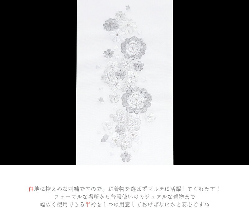 半衿 振袖 成人式 訪問着 刺繍 白地 礼装用 黒留袖 塩瀬 銀 シルバー グレー 梅 桜 菊 結婚式 前撮り 卒業式 謝恩会 入学式 卒園式 入園式 七五三 お宮参り お茶会 パーティー 観劇 日本製 ポリエステル 着物 和装 半襟 レトロ アンティーク モダン 高級 可愛い No.10-6589 サイズ表 サイズ 長さ:約114cm 幅:約16cm 商品詳細
