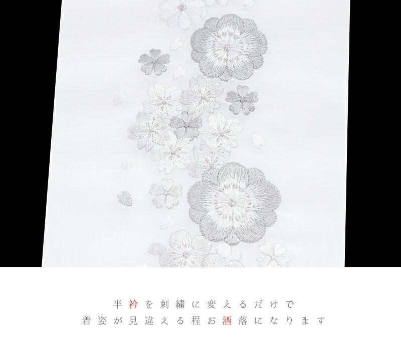 ■おすすめポイント お洒落は小物から・・・ 高級感あふれる、繊細で美しい刺繍が魅力的な 正絹風のなめらかな肌触りと上品な光沢を持ち合わせた いくつもコレクションしたくなる、おしゃれ半衿です。