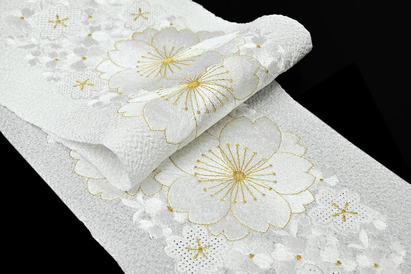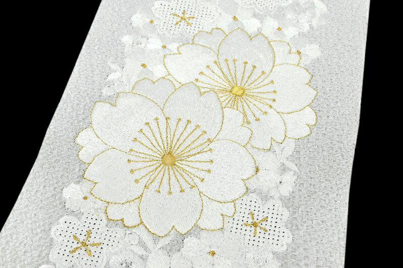 そこへふんわり舞うようにあしらわれた桜の意匠 細やかな刺繍は白、金糸のふっくらと愛らしい印象に。
