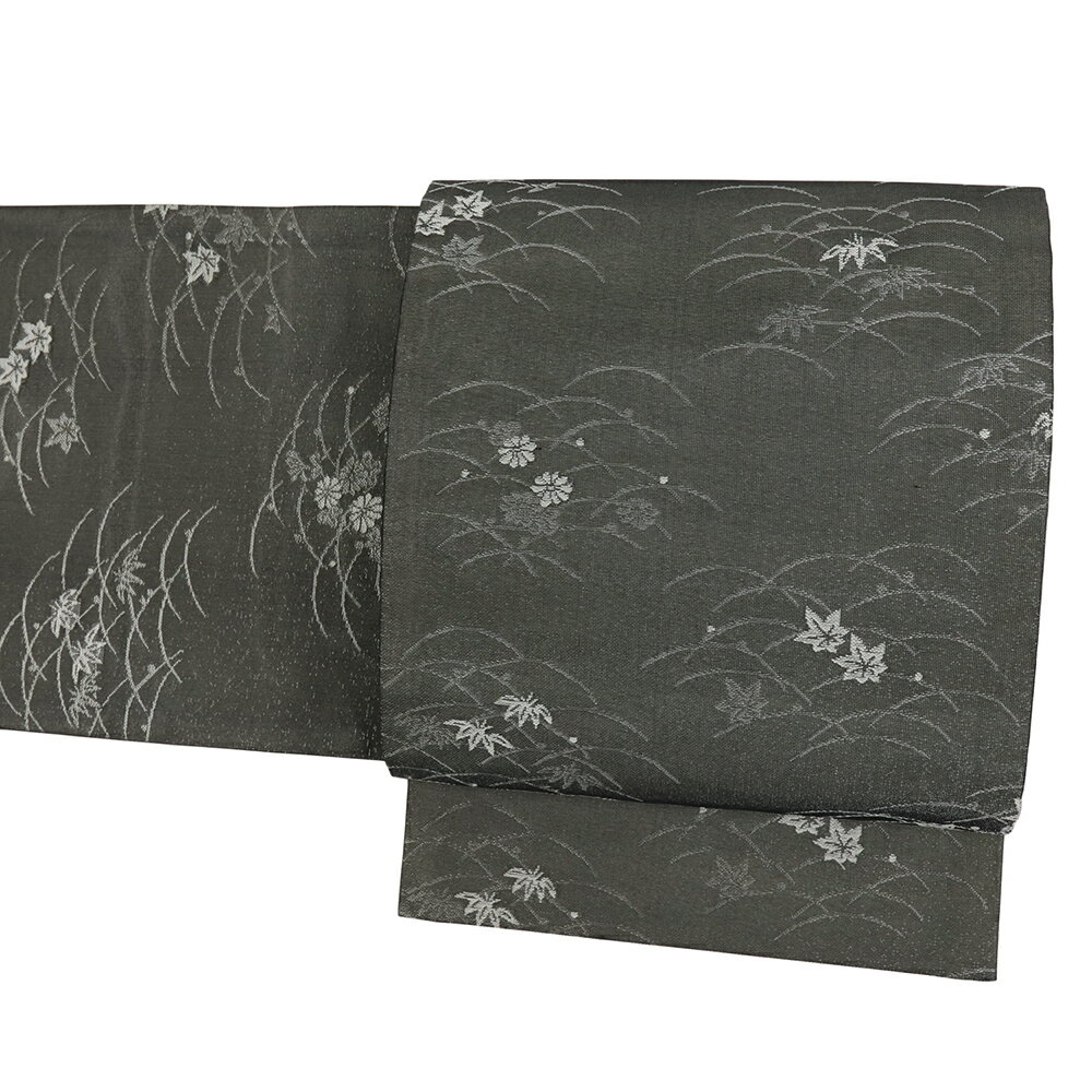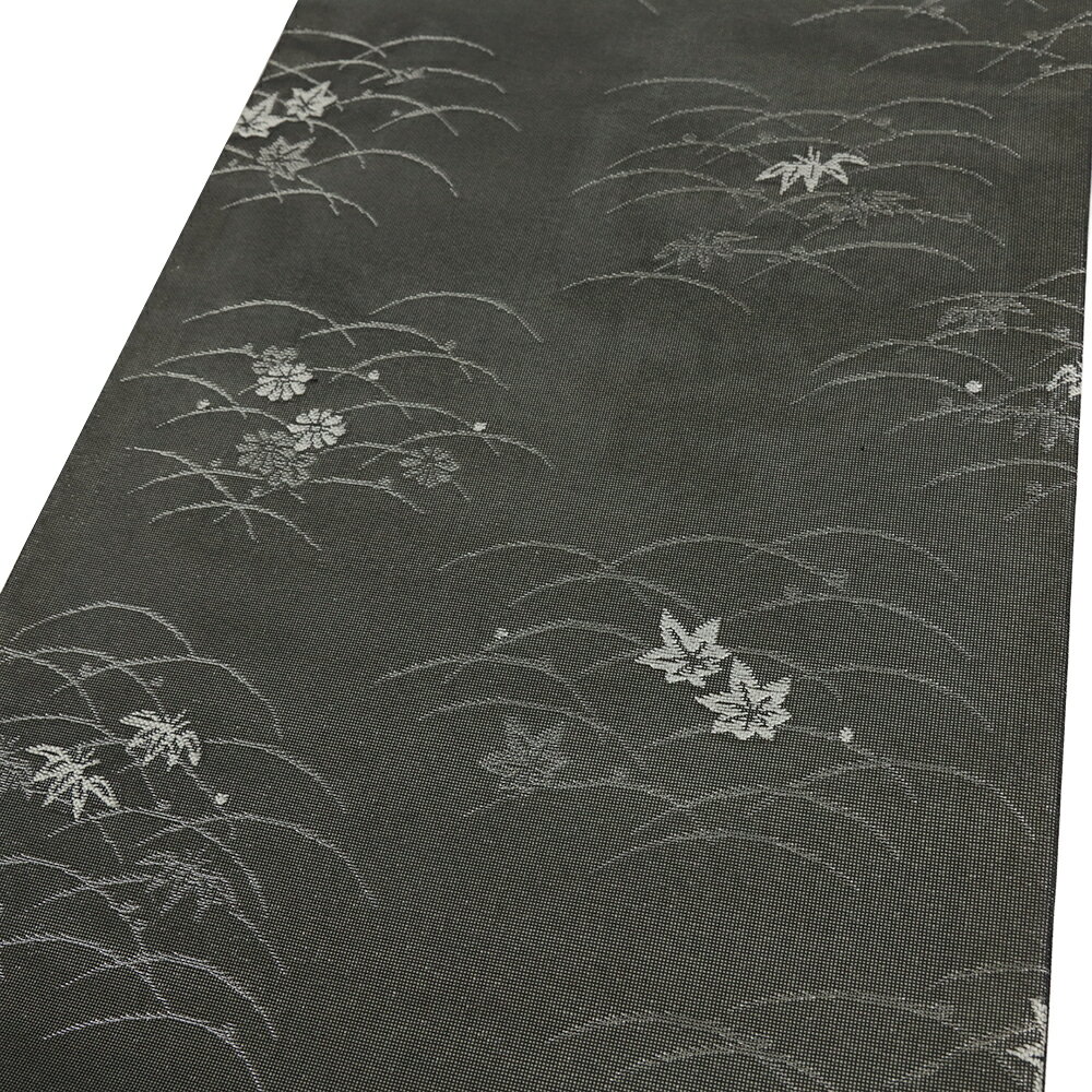 【 中古 】 名古屋帯 夏物 紗 正絹 黒地 ダークグレー 銀糸 花 菊 紅葉 笹 芝 仕立て上がり 夏帯 リサイクル カジュアル 西陣織 お洒落 開き仕立て No.i6-2294 サイズ表 サイズ cm 長さ 約359.5cm 幅 約31cm 商品詳細