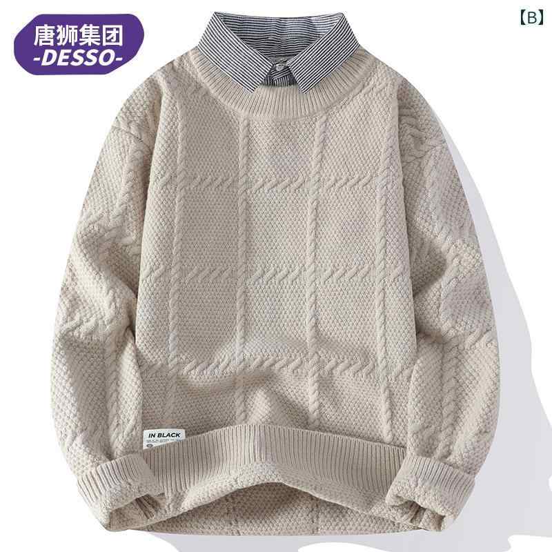 フェイクツーピース 重ね着風 セーター メンズ 冬新 スタイル シャツ ベース レイヤー ニット ウール.カラフルカラーオシャレデザインフィット感: ゆったりとしたフィット感詳細: -加工:しわになりにくい加工生地: -ベーシックスタイル:袖タイプ: レギュラー対象者: ティーンエイジャー適用シナリオ:日常生活素材構成: ポリアミド繊維(ナイロン) 37.8.新ポリエステル繊維 35.2.ポリアクリロニトリル繊維(アクリル) 27糸の太さ:レギュラー糸(10目.12目)適した季節: 冬スタイル: プルオーバー発売年とシーズン:秋厚さ: 厚め袖丈:長袖サブスタイル: な都会的なネックライン:クルーネックパターン: -サイズ: 3XL.2XL.M.L.XL.4XLカラー:カーキ.ダークグレー.ホワイト