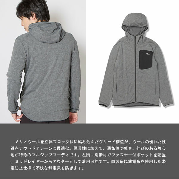 グリッドウールフーディグレー(020)メリノウールを立体ブロック状に編み込んだグリッド構造が、ウールの優れた性質をアウトドアシーンに最適化。