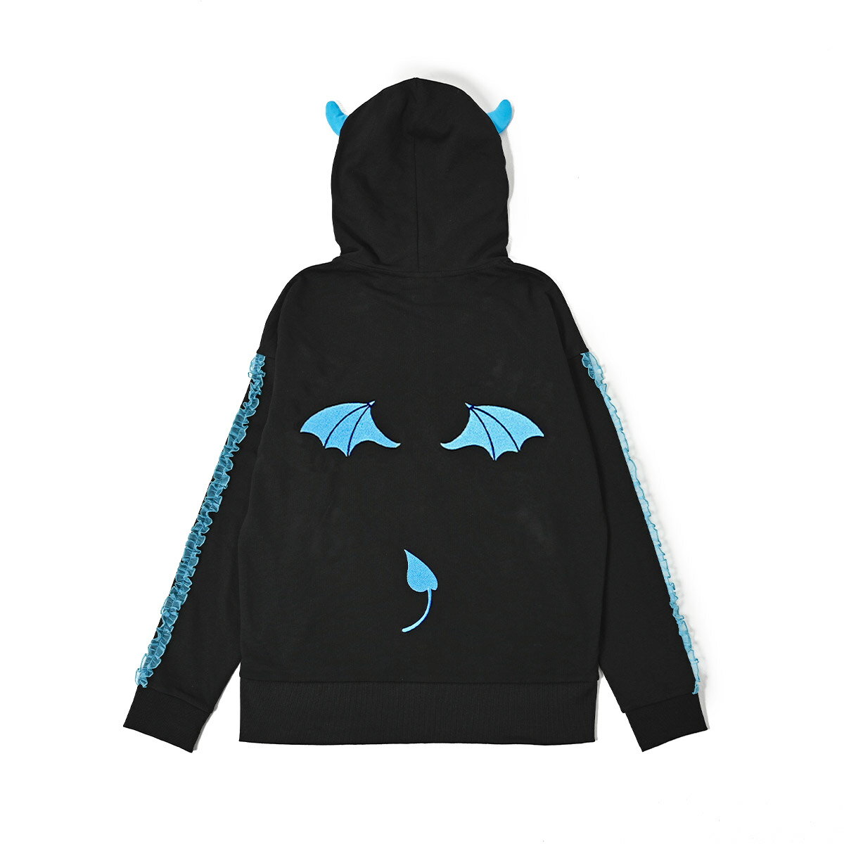 背面には、兄弟たちのパーカーのカラーリングに合わせた悪魔の羽と尻尾の刺繍が施されています。