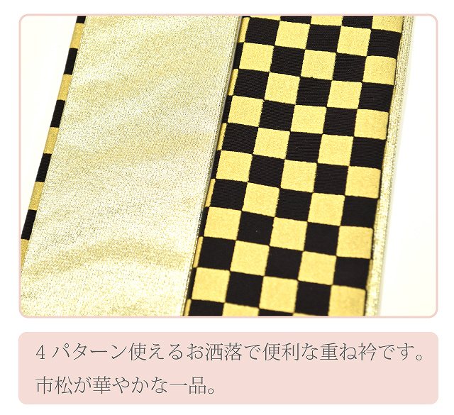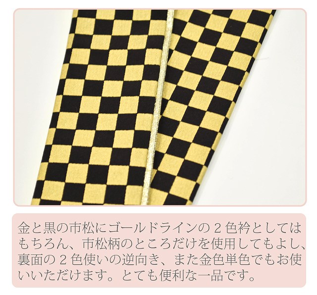 金と黒の市松にゴールドラインの2色衿としてはもちろん、市松柄のところだけを使用してもよし、裏面の2色使いの逆向き、また金色単色でもお使いいただけます。