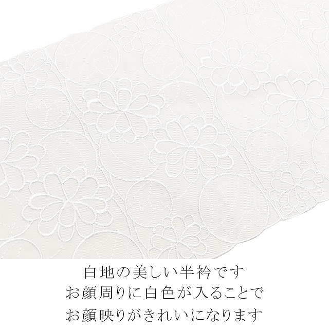 こちらの半衿は白色に豪華な花や鞠文様の刺繍が施されており使い勝手がよく、どんなお着物にも似合う半衿となっております。