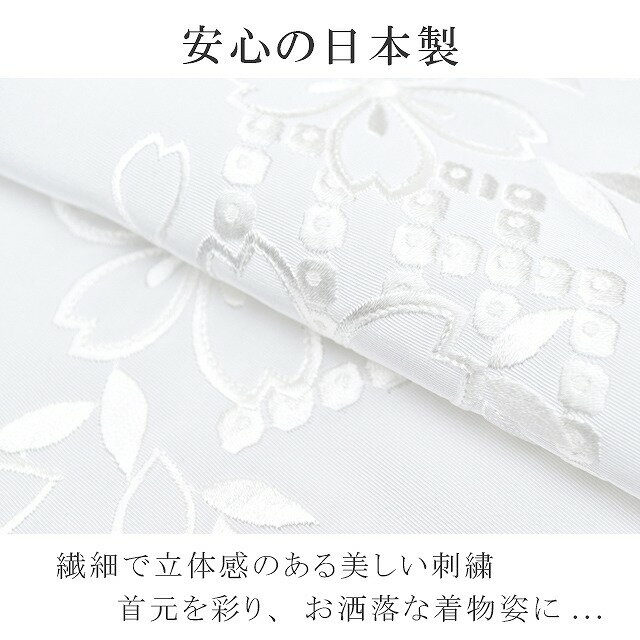 こちらの半衿は白色に桜 鹿の子の文様が華やかでかわいい刺繍が施されており、どんなお着物にも似合う半衿となっております。