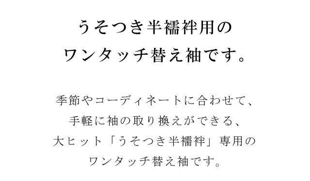 商品情報 替え袖 ワンタッチ替袖 うそつき半襦袢 夏用 朝 白 sin8078-bob12 ★説明 うそつき半襦袢に使用する替え袖です。
