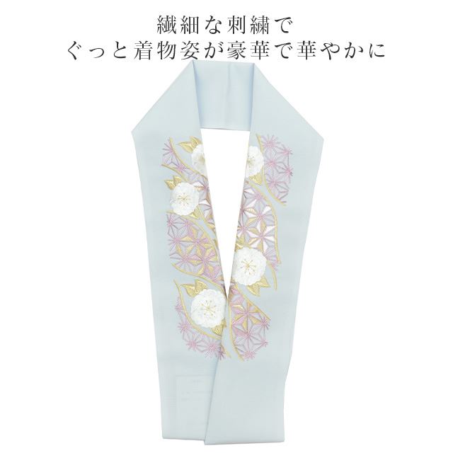 顔に近い衿部分に刺繍半襟を付けることによって全体的に更に明るくなり、艶やかに纏う事が出来ます。