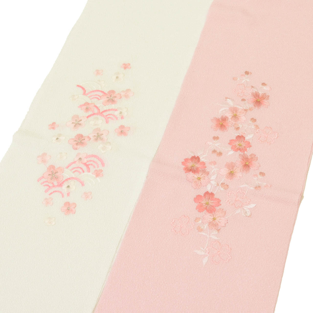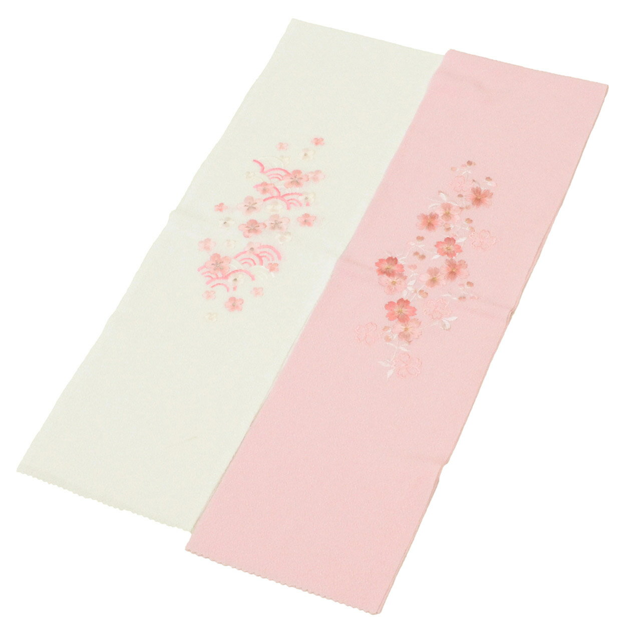 ※モニターの違いにより実際の色目と異なる場合がございます 宅配便発送の方 ゆうパケット発送の方 メール便発送の方半衿 2点セット リサイクル半衿 白 ピンク色系 花文様 振袖 長襦袢 刺繍 縮緬 女性 着付け小物 着物 和装小物 半襟