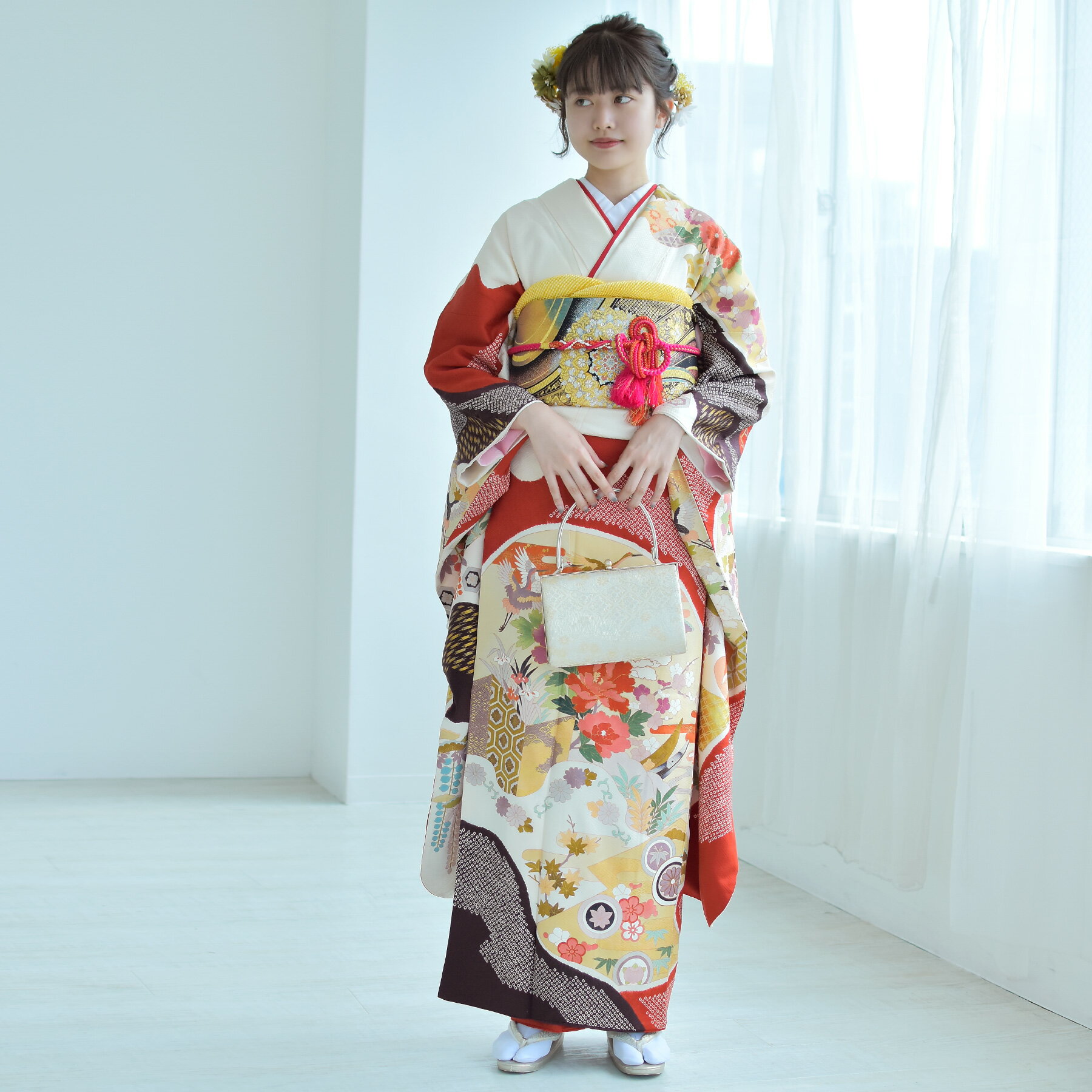 【セット内容】振袖・袋帯・草履・バッグ・長襦袢・帯〆・帯揚げ・重ね衿・肌襦袢・前板・着付けベルト・ウエストベルト・三重仮紐・腰ひも3本セット・帯まくら・伊達締め ・マジックベルト・衿芯・足袋(プレゼント)