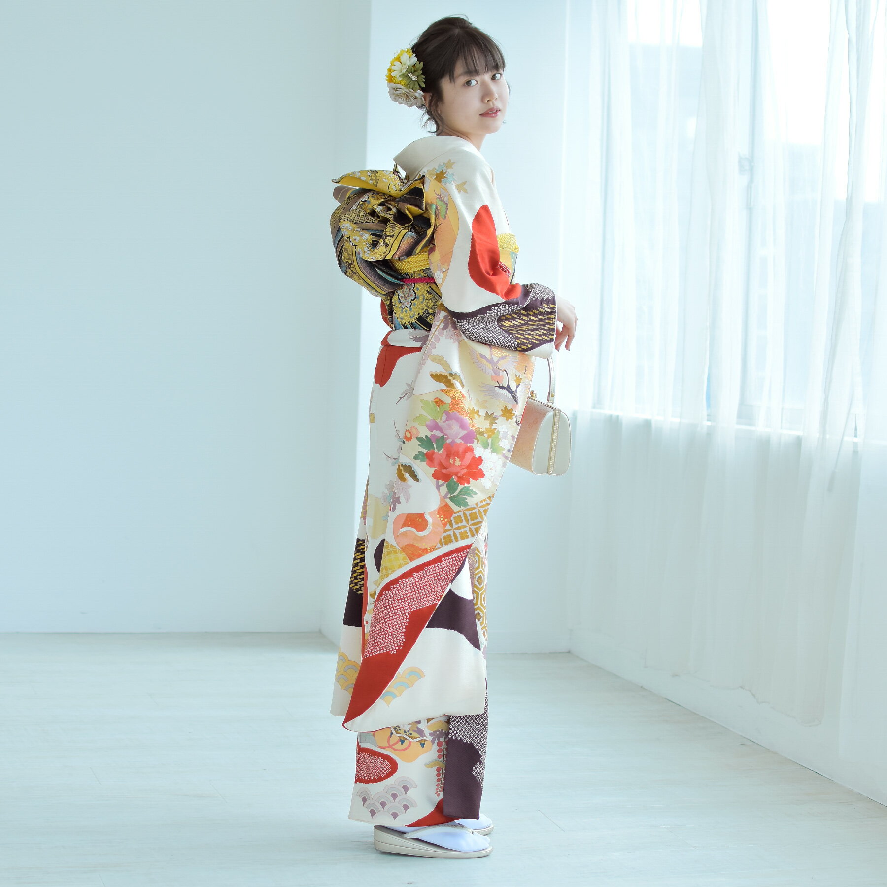 ■ Detail [ カラー ] マルチ系 [ 素材 ] 振袖/袋帯:正絹草履:合皮 [ 適応サイズ ] フリー(身長155-165cm) [ 実寸サイズ ] 身丈 約165cm・袖丈 約108cm・裄丈 約68cm足袋・草履 ワンサイズ(フリーサイズ)