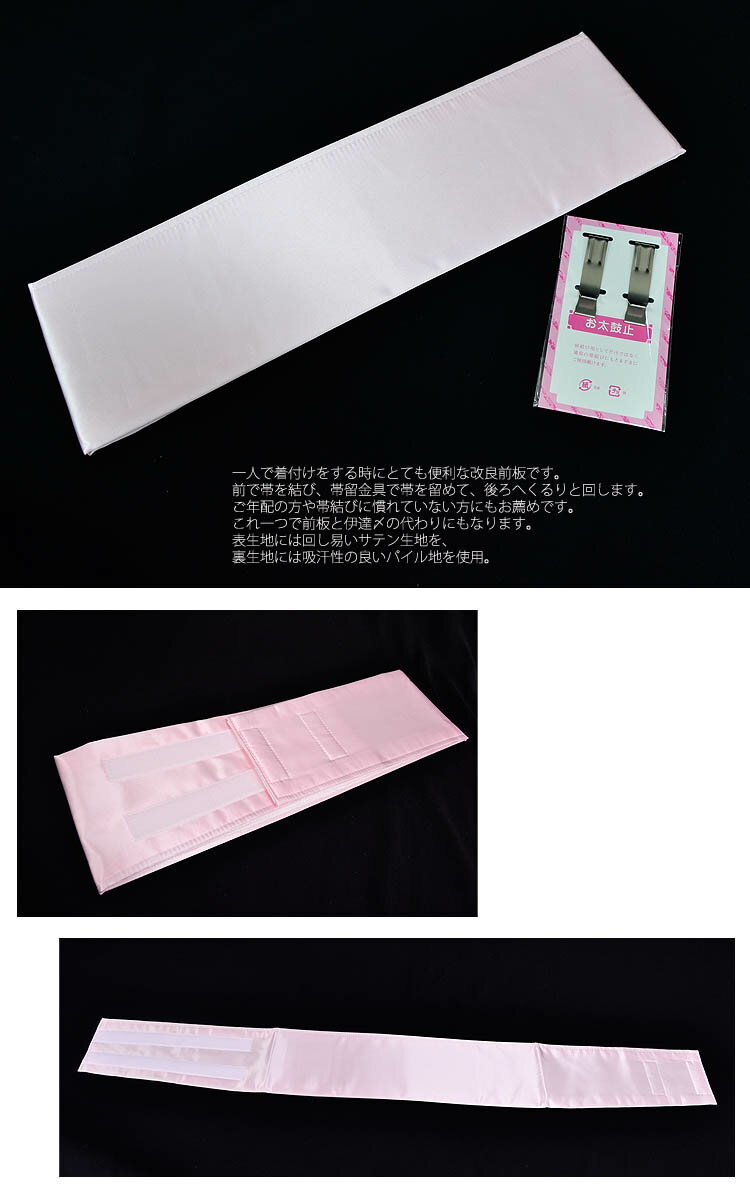 素材 表生地:アセテート 100% 裏生地:綿100% パイル地 中芯:ポリエチレン100%・不織布レーヨン65%、ポリエステル35% M=13cmx100cm (ウエスト約85cmまで) L=13cmx120cm (ウエスト約106cmまで) 一人で着付けをする時にとても便利な改良前板です。