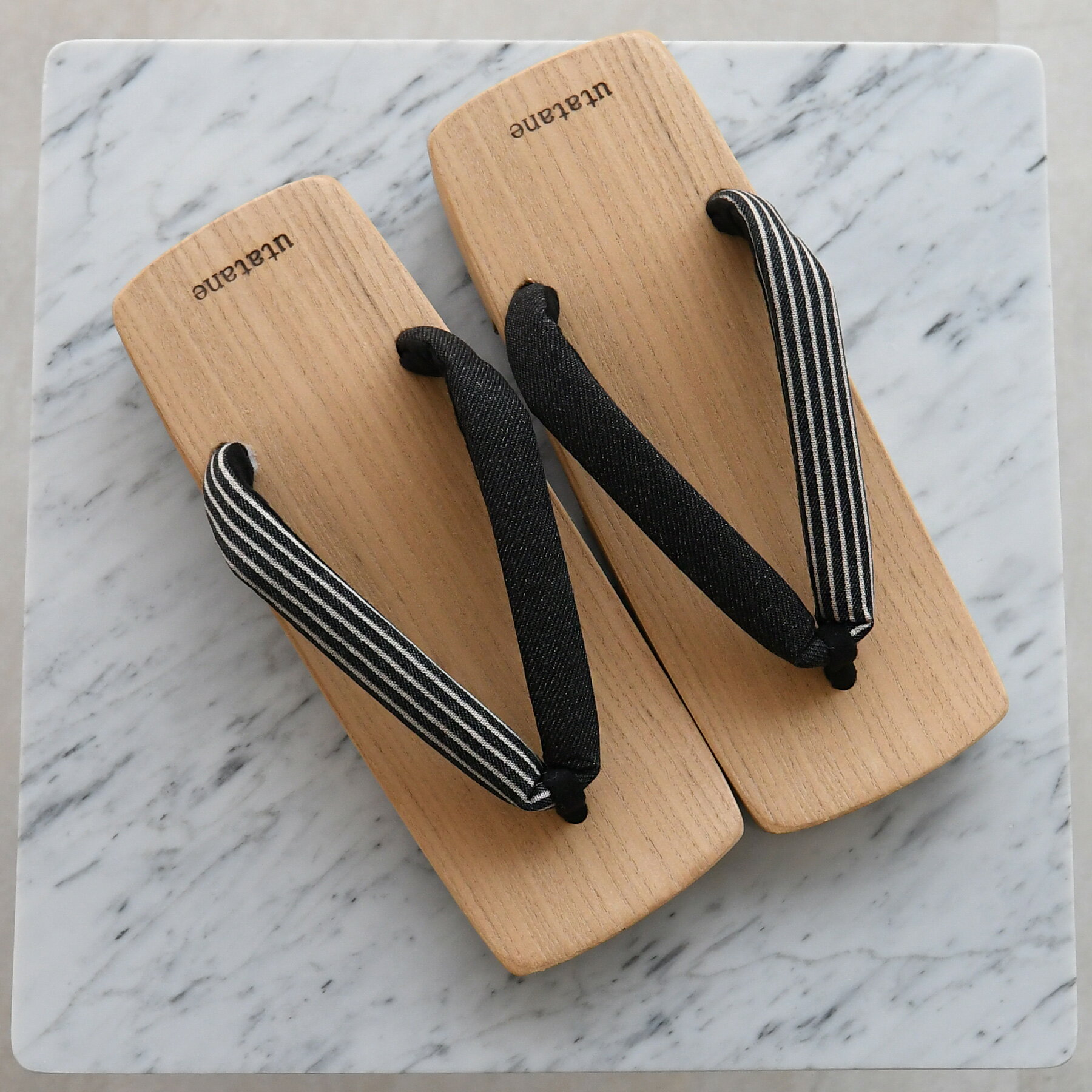 鼻緒にはデニム生地使用し、無地とストライプのアシンメトリーデザインに仕上げています。