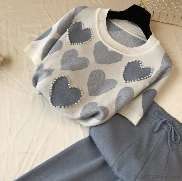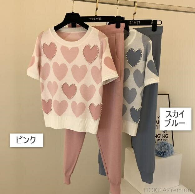 【多彩なシーンに活躍】・お出かけやカジュアルなデート、オフィスのリラックススタイルにも最適レディース セットアップ ニット 半袖 トップス 九分丈パンツ ジオメトリック ビジュー付き 春夏 2点セット 小柄な方にも嬉しい脚長効果。