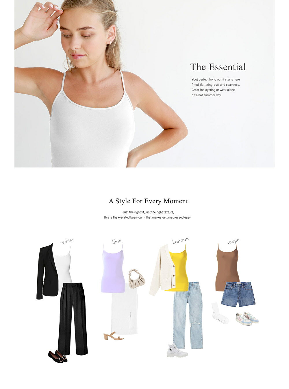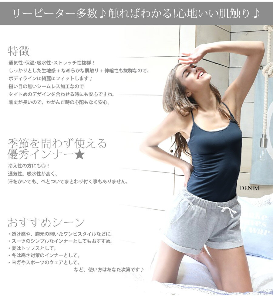 1年中、活用できるので気分や洋服に合わせて色違いで手に入れたいアイテム☆ 普段使いのインナーとしてはもちろん、ヨガウェアとしてもリピーター多数♪ 当店で大人気のキャミです!