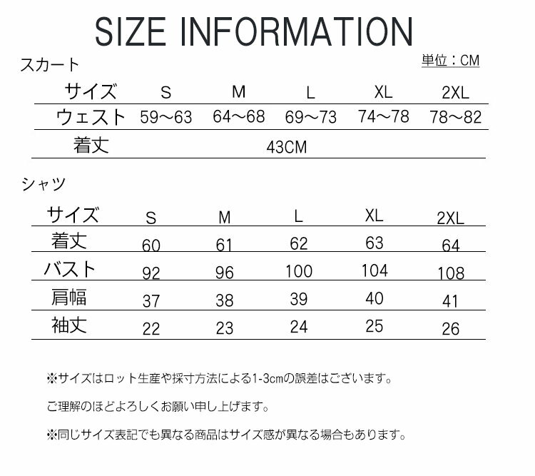 【半袖シャツ+スカート+ネクタイ】 ◆サイズ:S M L LL(XL相当) 3L(2XL相当) ◆生産国:中国製 備 考