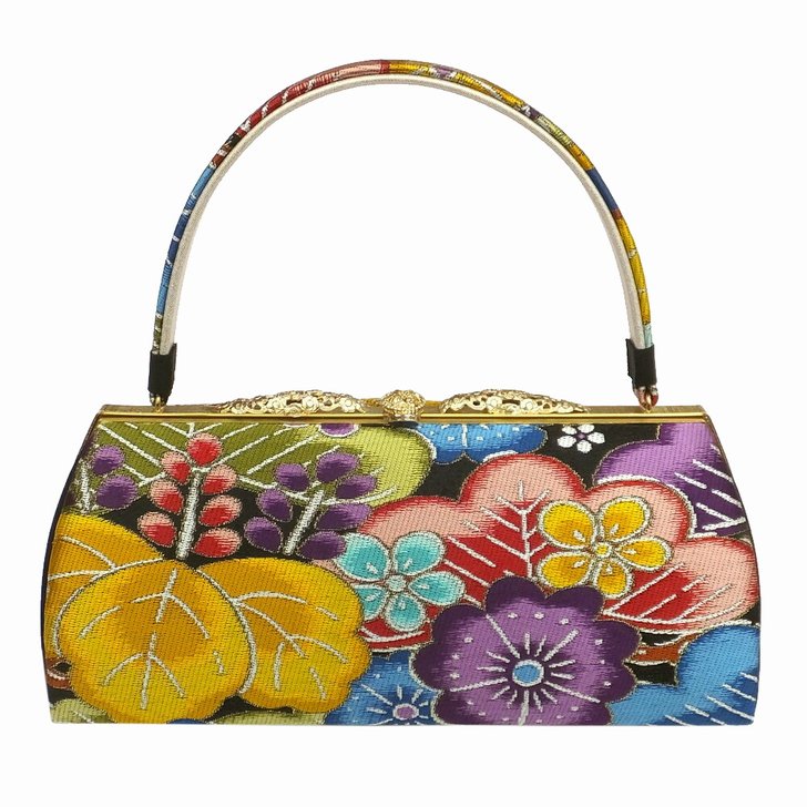 バッグは華やかな色合いの紅型調の柄で、松・梅・桐などおめでたい柄が両面から底面に織り込まれています。