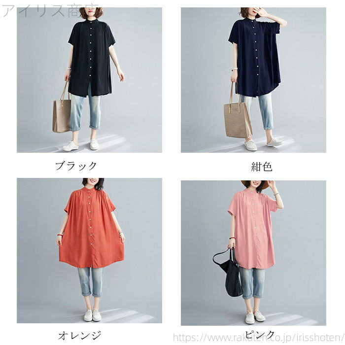 チュニック ロングシャツ 半袖 夏 シャツ ブラウス 羽織 半袖シャツ 黒 ロング丈 大きいサイズ シャツブラウス 無地 体型カバー チュニックワンピ アウター ギャザー入り 立ち襟 ゆったり 紺色 白 半袖 着まわし 羽織り 夏 50代 40代 30代 20代 送料無料 裾へ向かって広がるAラインシルエットが、カジュアルさにエレガントなエッセンスをプラスします。