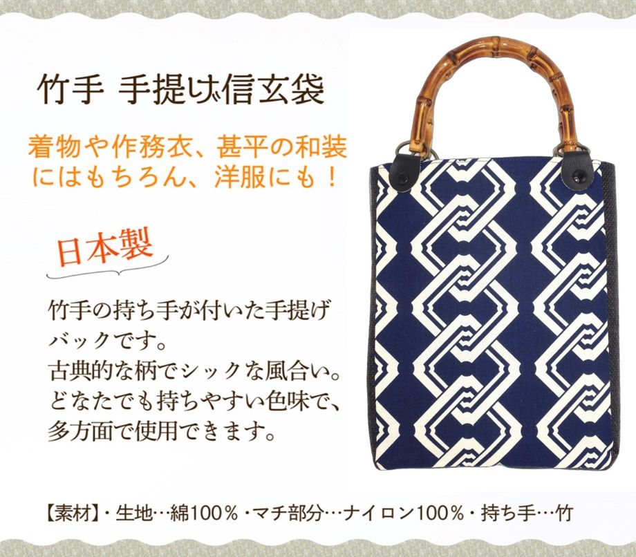 サイズ 縦:約27cm 横:約20cm マチ:約4cm 竹手の長さ:約10cm 素材 生地:綿100%マチ部分:ナイロン100%持ち手:竹 原産国 日本 商品説明 竹手の持ち手が付いた手提げバックです。