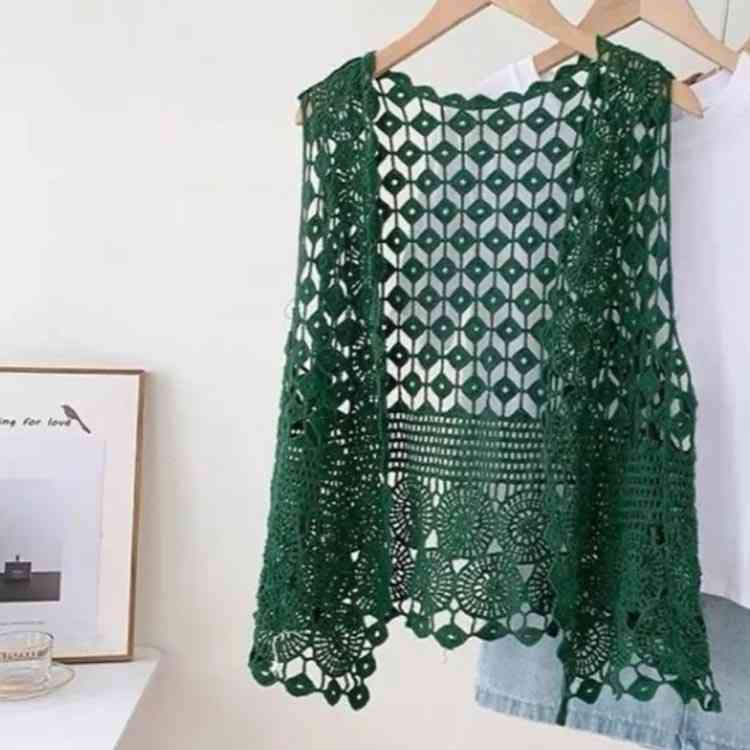 透け感のある編みデザインがおしゃれ着るだけで旬のレイヤードスタイルが完成です。
