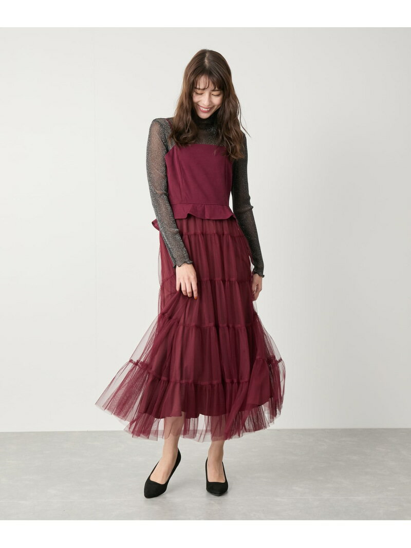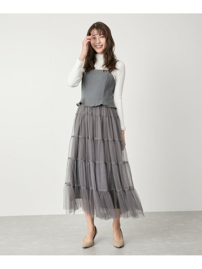 【デザイン・シルエット】スカート部分がチュールに切り替えられた、レディなジャンパードレスです。