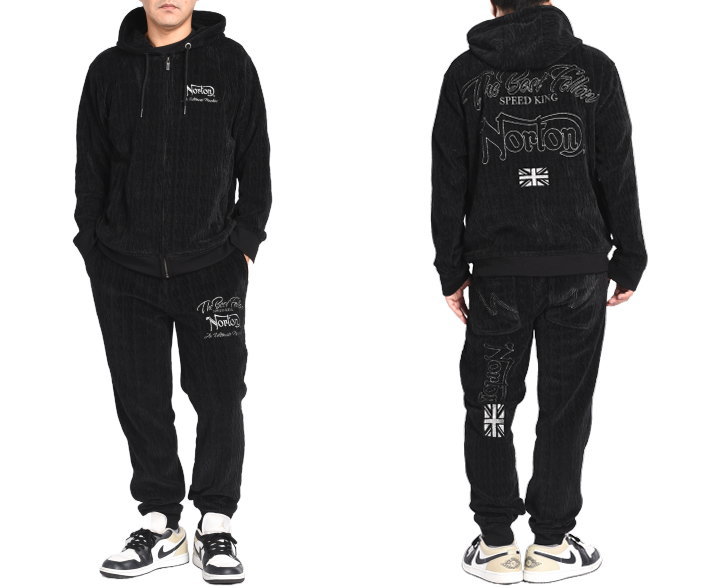 ■程良い光沢感が上品で大人な印象を醸し出す、ベロアコール生地で仕立てたイージーパンツ! お馴染みのドッグNortonロゴやユニオンジャックをさりげなく落とし込んだ、センスの光るクールなデザイン! デザインは全てシルバーのラメ刺繍で施された豪華な仕様になっており、派手過ぎないシンプルなデザインでありながら抜群の存在感を誇っています。