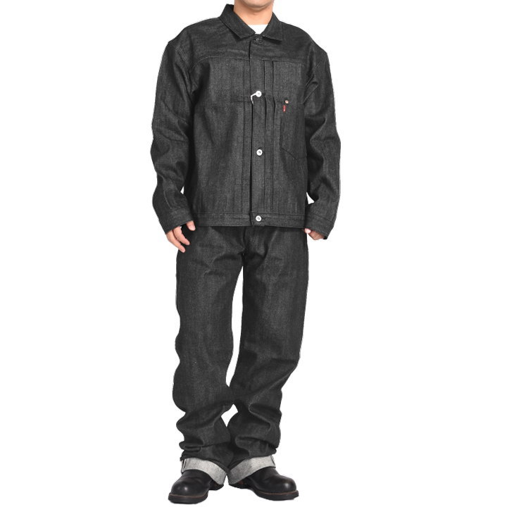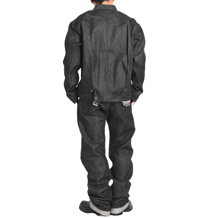 ■Leather labels: Goat skin 下目に配されたダウン革ラベル(1940年代初期の稀少仕様) 主なdetail: ・1942年頃の大戦モデルをモチーフにブラックデニムで製作 ・12.5オンス 赤耳セルビッチ・ブラックデニム(前立て裏セルビッジ) ・ブラックで統一した縫製仕様 ・背中のセンターでつなぎ目のあるスプリットバック仕様(Tバック) ・山羊革製レザーパッチ ・月桂樹ワンスターのドーナツボタン(フロントは4つボタン仕様) ・フラップが省略された胸ポケット(剥き出しリベット・片ポケット) ・銅製の打ち抜きリベット(GA-SL&CO.刻印) ・前見頃のアクションプリーツ+ボックスステッチ(左右で高さがずれた仕様) ・サイズ調整はシンチバック(2本針・鉄製ユリバックル) ・背中の内向きアクションプリーツ ・リジット(ノンウォッシュ・未洗い) ・Made in JAPAN(日本製)