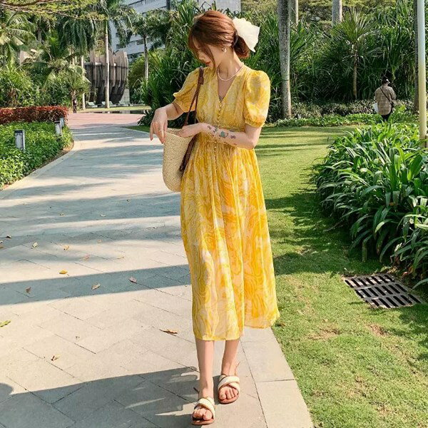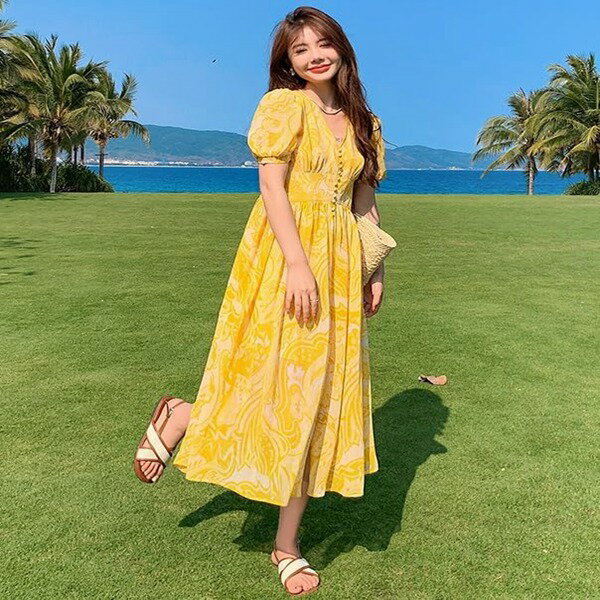 説明 "ビーチで輝く黄色いペイズリー柄のロングワンピース - 夏のデートやリゾートにぴったりなAラインフレアシフォンワンピース" 大人エレガントな雰囲気漂うペイズリー柄風のロングワンピースが登場! ロング丈で脚をしっかり隠しながら、スタイリッシュな印象を演出します。