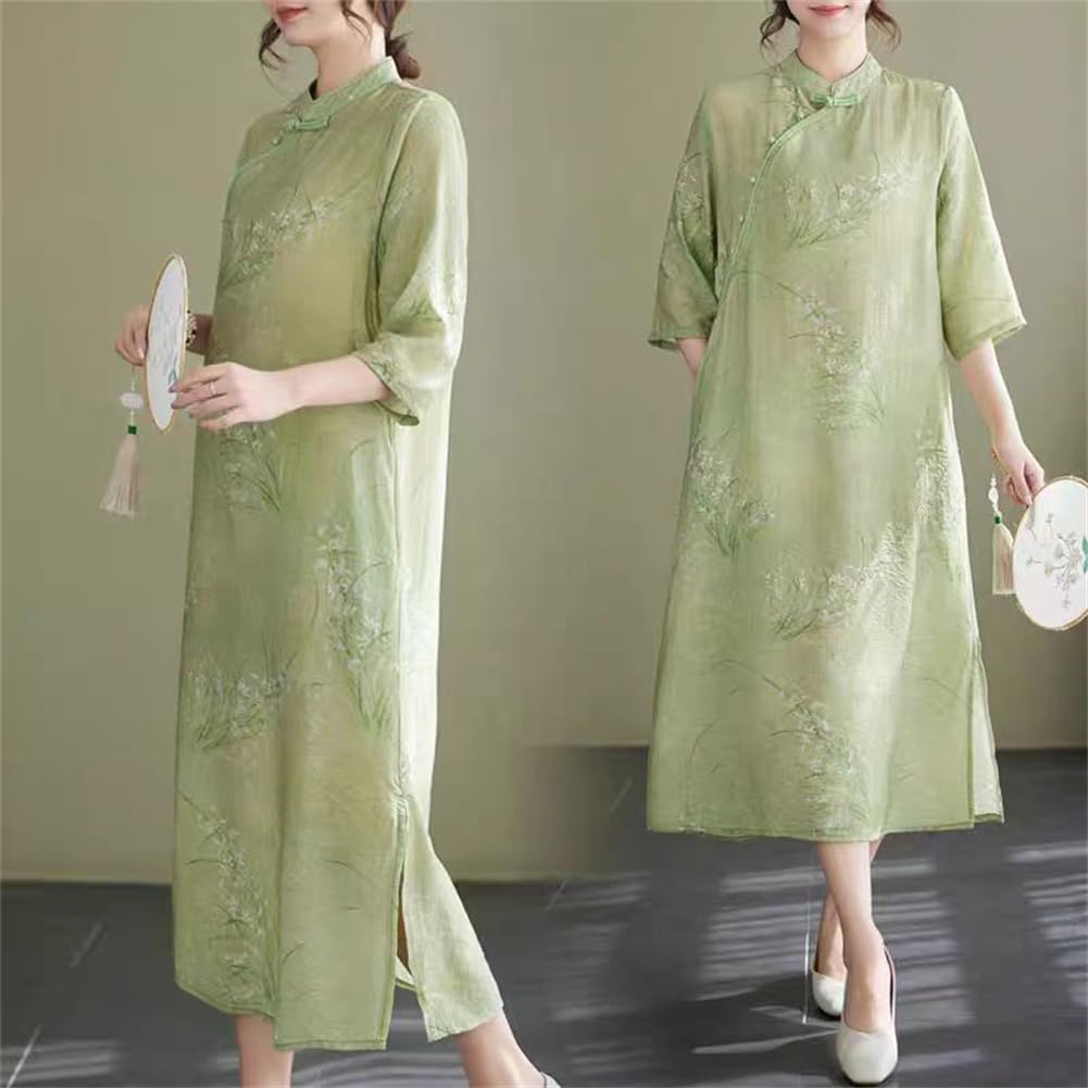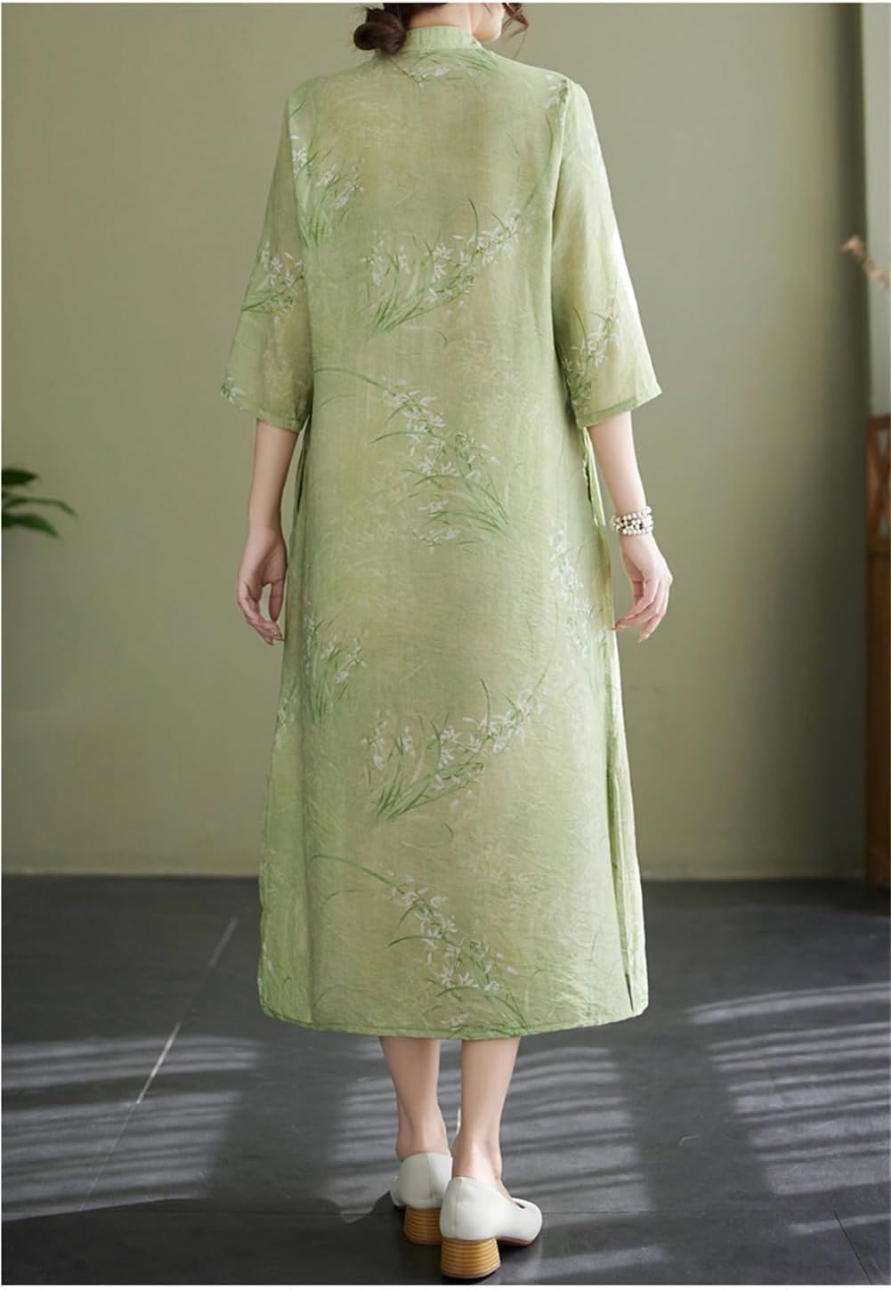 [TAITENG] 綿麻 ワンピース チャイナワンピース チャイナドレス チーパオ ドレス 夏ワンピ 七分袖 立ち襟 ミモレ丈 花柄 民族風 ゆったり 体型カバー カジュアル 通気性 コットン チャイナボタン 春 夏