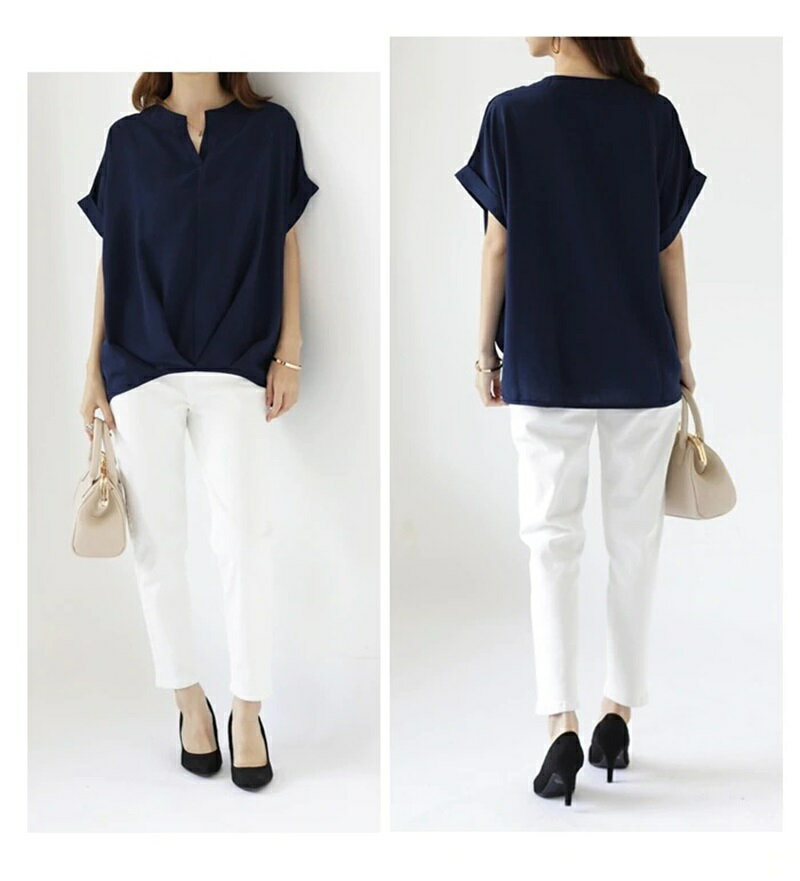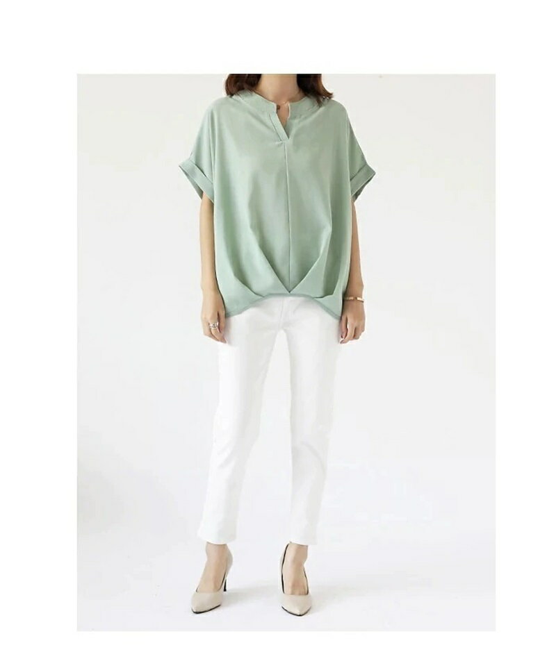 デコルテを綺麗に見せるVネック、二の腕をさりげなくカバーしてくれるするドルマンスリーブ、ゆったりと着れるシルエットが魅力です。 合わせるボトムスによってきれい目にもカジュアルにも着回しOK。スッキリしたパンツに合わせるとオフィスでも活躍しそうです。