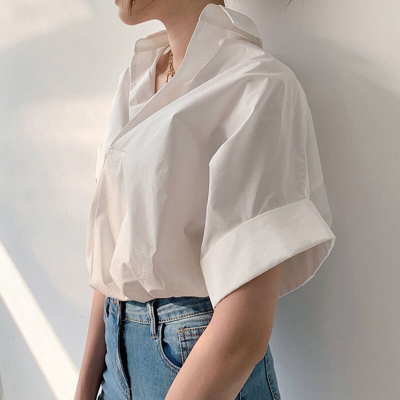 合わせるアイテムを選ばず、ブラウス一枚で着映えするからこそボトムはベーシックなものでもOK。