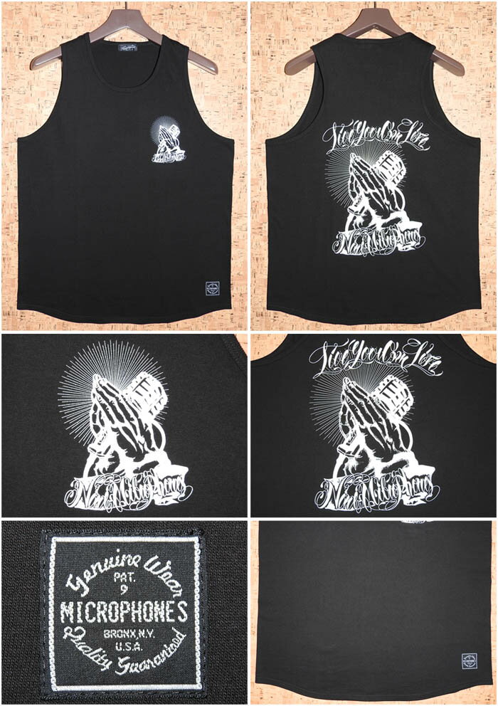 M [肩幅:29胸囲:108着丈:70] L [肩幅:32胸囲:114着丈:75] XL[肩幅:35胸囲:120着丈:80] 左胸とバックにナインマイクロフォンズのメイングラフィックの一つ、『Pray with the microphone』がプリントされており、左裾にはブランドタグが縫い付けてあります。