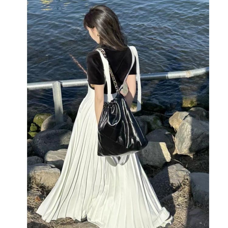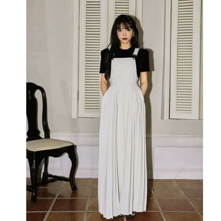 やわらかくふんわりとした女性らしいフレアシルエットのプリーツスカートサロペット。