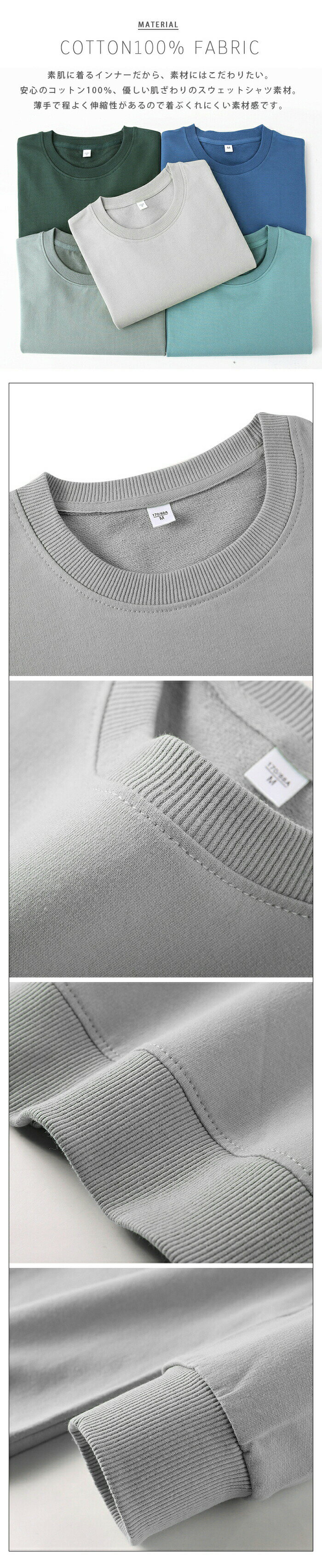 素材タイプA「配色」 表地:コットン56.1%&ポリエステル43.9%、裏地:ポリエステル94.2%&ポリウレタン5.8%タイプB:コットン100%タイプC「裏起毛」 表地:コットン56.1%&ポリエステル43.9%、裏地:ポリエステル94.2%&ポリウレタン5.8%カラー展開