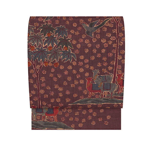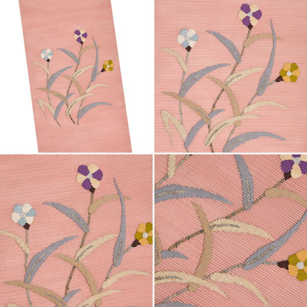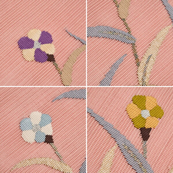 豊かさの感じられる退紅色の地色もとても魅力的ですが、小さなお花をつけた草が色々な色糸を使って、すくい織で表されているのも見事です。