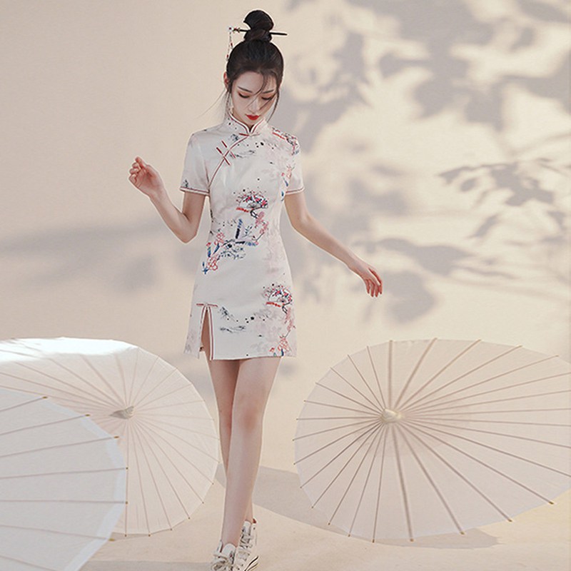 鮮やかな花がプリントされた、ミニ丈がセクシーなチャイナドレス。