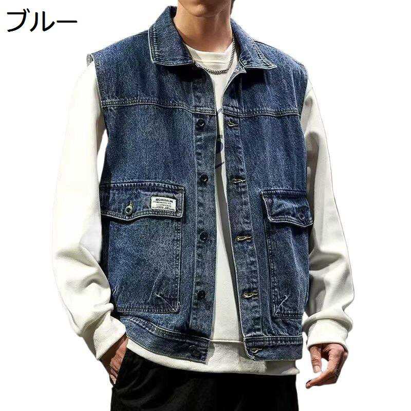 【デニム素材】抜群の仕上がりでブラスト加工が効いたメンズ ゆったり デニムベスト、人気のアイテムです。