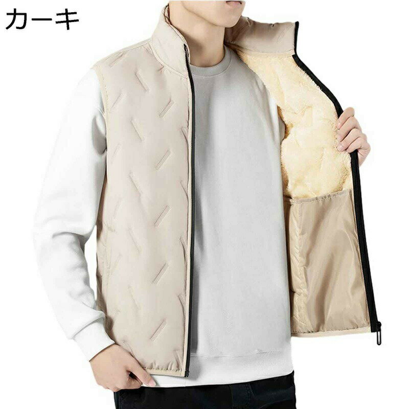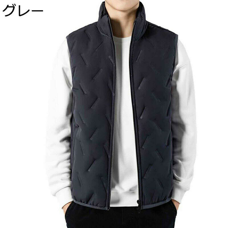 メンズ袖なしスタンド襟ダウンベスト、大きいサイズが有り、暖かい着心地、室外防寒具として大活躍。