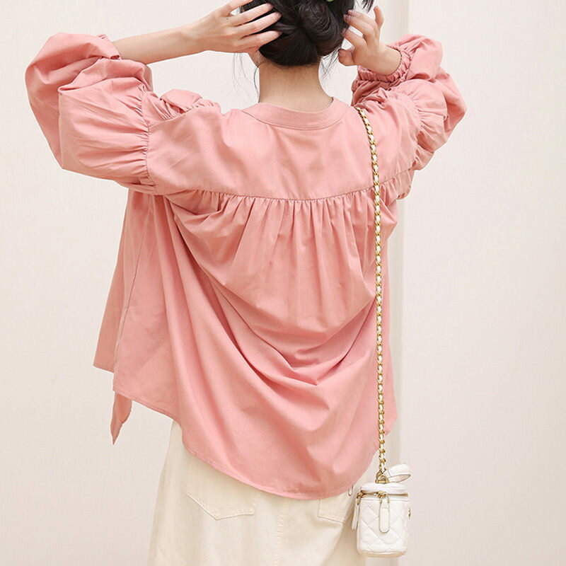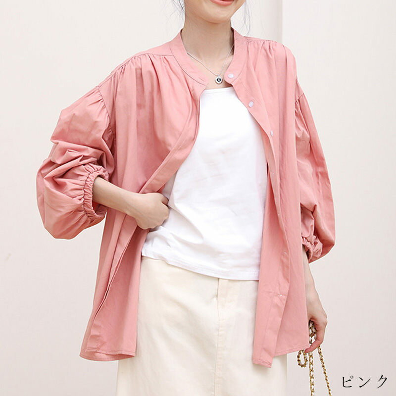 シャツ 羽織り レディース 夏 薄手 チュニック ブラウス 長袖 ボリューム スリーブ シャツブラウス コットン トップス ロングシャツ 羽織もの 羽織り 大きめ 冷房対策 UV対策 シャツ バンドカラー バルーン袖 おしゃれ きれいめ たっぷりギャザー ギャザー 大きいサイズ ゆったり 体型カバー お尻隠し 大人可愛い 快適 着心地良い