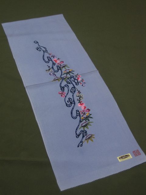 紅型特有の大胆な色使いで、ブルーグレーの地に流水と松竹梅を鮮やかに描いています。