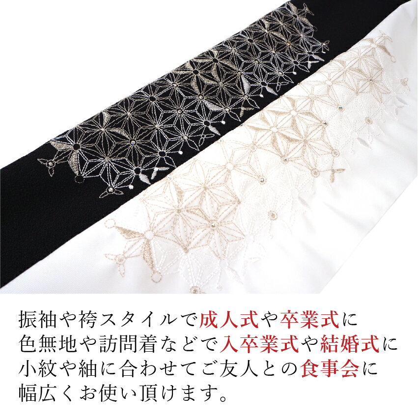 色柄 No.1 白 白地、麻の葉にラインストーン柄 No.2 黒 黒地、麻の葉にラインストーン柄 相性ぴったりな着物! 振袖 二尺袖 訪問着 色無地 小紋 紬 お出掛け先 成人式、卒業式、結婚式、パーティー、ホテル、食事会、観劇などフォーマルからカジュアルまで 長所 正絹風のつややかな光沢となめらかな肌触り。