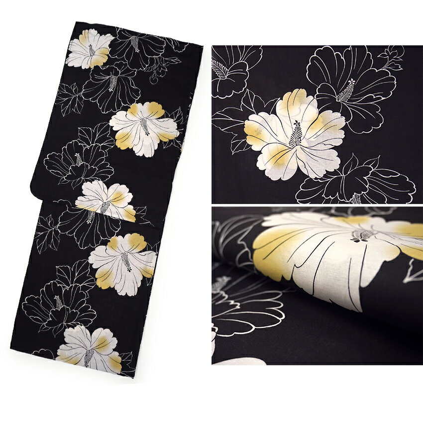 色柄詳細 やや白みの墨黒の地に、白い木槿の花が柔らかな描線でデザインされています。