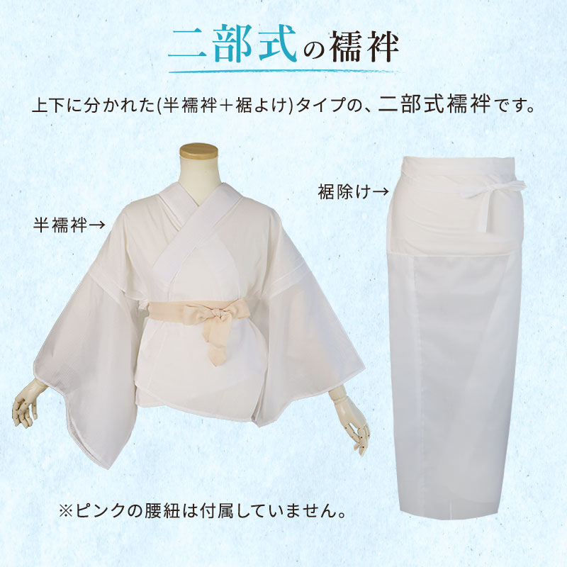 絽(ポリエステル)の半衿が縫い付けられていて、お仕立て上がっておりますので、 届いてすぐに着られるのが嬉しいですね! 絽の二部式襦袢(ポリエステル) こちらの襦袢は、上下に分かれた(半襦袢+裾よけ)タイプの二部式襦袢です。